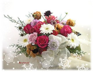 | 花材 | バラ・赤/ バラ・ピンク/ ヒペリカム/ コットンツリー/オンシジウム/ サンキライ/ ヒノキ |