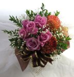 おちついたピンク色のバラを、銀梅花のグリーンとカスミソウの白でまぁるくまとめました。