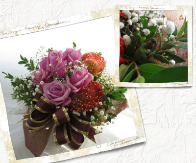| 花材 | バラ/ ピンクッション/カスミソウ/ 銀梅花(マートル) |
