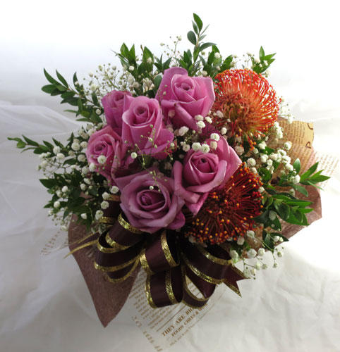 ピンクのバラとカスミソウに、オレンジのピンクッションを添えた、エレガントな色合いのアレンジメントです。