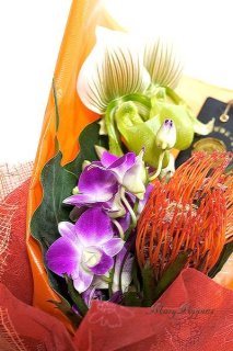 | 花材 | プリザーブドフラワー:バラ(ピンク/ 赤/ 黄色)/ ミニバラ(赤)/ マウンテン・ジュニパー| ドライフラワー:ペッパーベリー/ ハスの実/ ザクロの実/ クラスペディア/ 銀松笠 |
