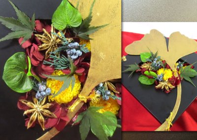 大きなゴールドの銀杏の葉が目をひく、壁掛け、直置きのできるプリザーブドフラワーのアレンジです。