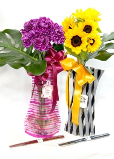 カーネーションの花束を、たためば1枚のビニールシートになる便利な花器(花瓶)に入れてお届けします。