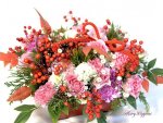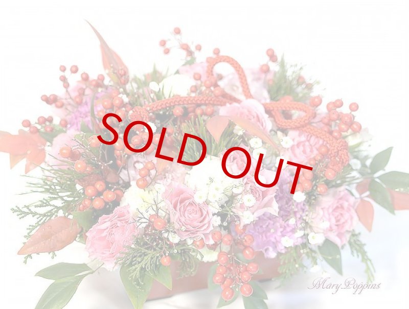 ピンクのミニバラや、カーネーション、白いピンポンマムの間に松をあしらい、赤い南天の実と、南天の葉をたっぷり飾った、御祝にぴったりなアレンジメントです。