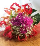 燃え立つ炎の様な花びらのグロリオーサを花束の周囲にあしらった、上品で、情熱的な花束です。