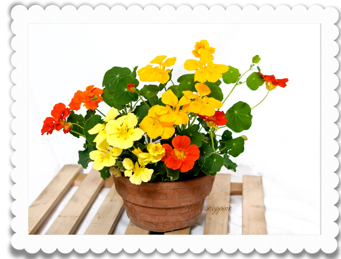 黄色〜オレンジ系の明るい元気色の、ナスタチウムの鉢植えギフトです。まぁるい、蓮の様な形の葉っぱもかわいいですね。