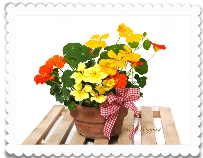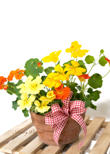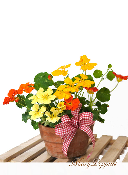ハーブとしても使われる、ナスタチウムの鉢植えギフトです。レンガ色の素焼きポットでお届けします。