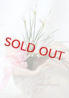 ゼフィランサス3輪を、パールのガーラーンドとアレンジし、底面には透明感のあるビー玉と、浄化力があるといわれる水晶のさざれ石。パールのガーランドは、水中の泡の様なイメージです。ボトルの上部には上品なゴールドのタッセルを飾りました。