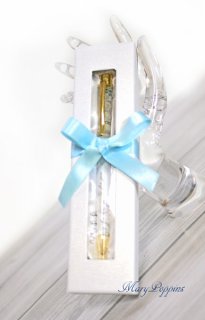 ハート型のガラスボトルの上部にはイメージカラーの紫の樹脂オーナメントが付いたタッセルをアクセントにしています。