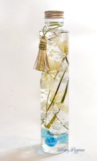 彼岸花の長いシベが引き立つよう、大きめの薬瓶型ボトルにおつくりしています。ボトルキャップもガラスで、上からも少し覗いていただく事ができます。