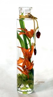 古くから日本に自生する夏の和花、「桔梗」、「女郎花」「鬼灯」を、染めたクラック水晶と共に、六角形のボトルにアレンジしたハーバリウムです。