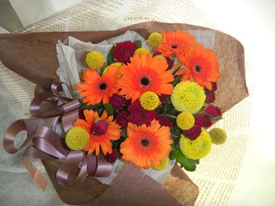 オレンジと黄色のお花のかわいい花束。チョコ色のラッピングでエレガントにまとめました。