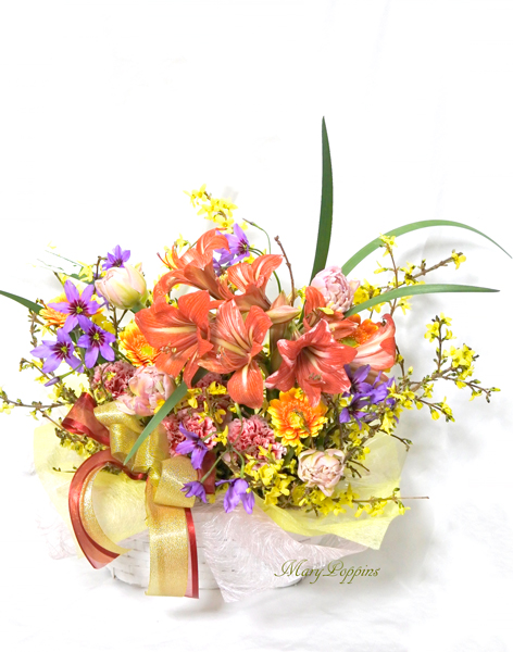 アマリリスと連翹の春のアレンジメント [arenji36b]