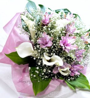 | 花材 | カラー/ デンファレ/ バラ/ カーネーション/ カスミソウ/ ステルンクーゲル/ ハラン/ アイビー/ ベアグラス |